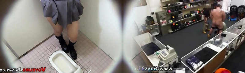 Japanese babes urinating golden piss in urinal POV voyeur