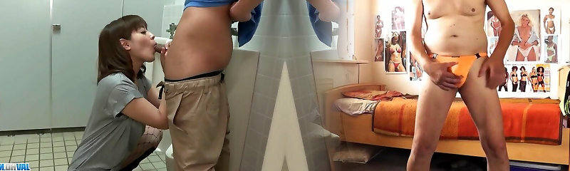 Japanese chick Teacher tricked Young Guy to suck his Dick