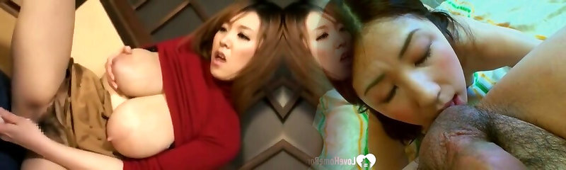 Fondling and sucking on her huge congenital Japanese breasts
