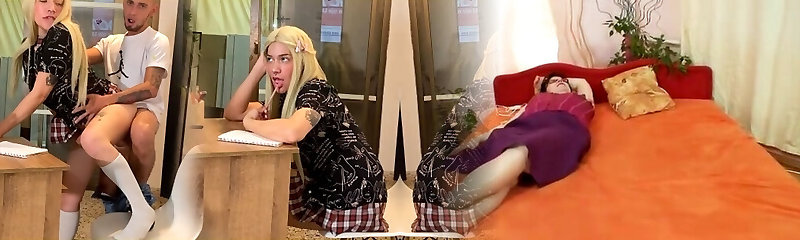 White leggy cheerleader blows tiny penis of Asian stud voraciously