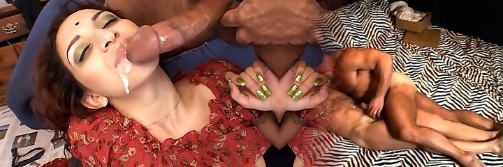 Black hair honey with nice tits on sofa fucking massive cock watched by sexy ash-blonde
